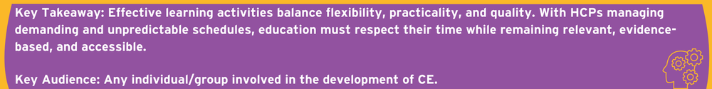Effective learning activities balance flexibility, practicality and quality. With HCPs managing demanding and unpredictable schedules, education must respect their time while remaining relevant, evidence-based and accessible. In short: