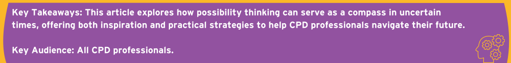 This article explores how possibility thinking can serve as a compass in uncertain times, offering both inspiration and practical strategies to help CPD professionals navigate what’s next.