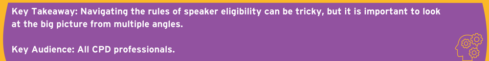 You work behind the scenes to calm tensions and propose a compliant alternative — perhaps the ineligible speaker is shifted to a non-accredited, clearly labeled session (e.g., an industry-sponsored lunch) that is separate from the certified activity. Leadership is satisfied that their chosen expert is still visible, even if not in the accredited spotlight. The course proceeds without compliance risk, and you maintain your position, relationships and peace of mind.