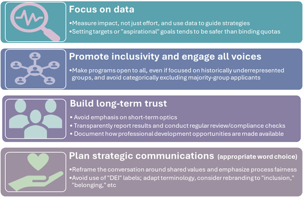 Here are four recommended actions and/or design practices that could help support successful DEI efforts.