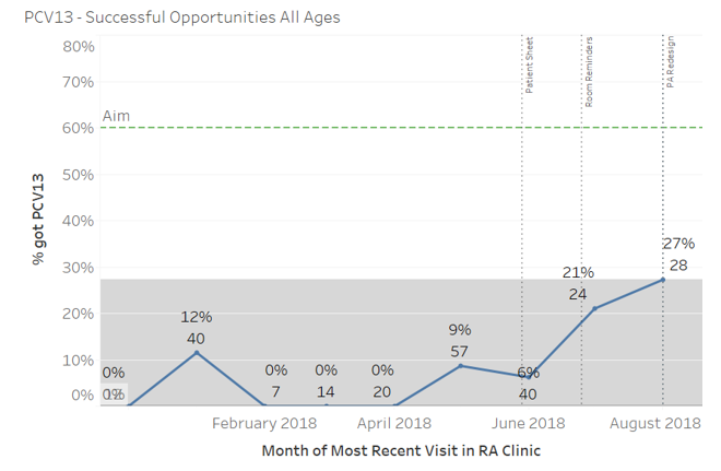 Past performance data revealed that when presenting in clinic, only 2 percent of eligible patients were successfully immunized against pneumococcal pneumonia. Based on the alarming gap in performance, the initial aim of the initiative was to vaccinate 60 percent of immunosuppressed patients eligible to receive a pneumococcal vaccine in four months’ time. For the department of rheumatology, this meant vaccinating 75 patients per week with nursing resources1 amounting to only 1.5 FTEs. Despite ample knowledge of the challenges at hand, the team decided to adapt an intervention that was efficacious in an Inflammatory Bowel Disease (IBD) Clinic with a similar patient demographic within our same safety-net hospital.