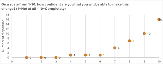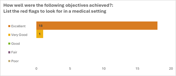 - Screening and Identification: 94.7% of attendees said they could now list red flags and describe effective intervention techniques. Nearly a quarter committed to improving diagnosis and screening, with one attendee noting, “I’ll ask about tattoos as a conversation starter — it may reveal more than you’d think.”