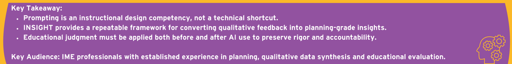 It also aligns with guidance from the Alliance AI Committee, which underscores the importance of human oversight, domain expertise, and critical evaluation when integrating generative AI into continuing healthcare education. ² Together, these sources support the session's conclusion that IME professionals develop prompt design skills most effectively through embedded, practice-based application within routine planning and evaluation activities.