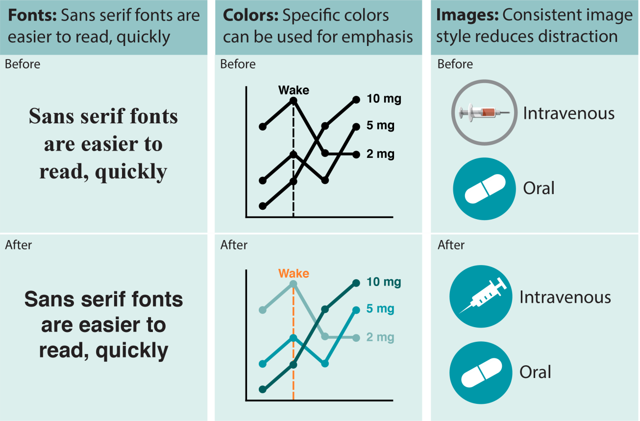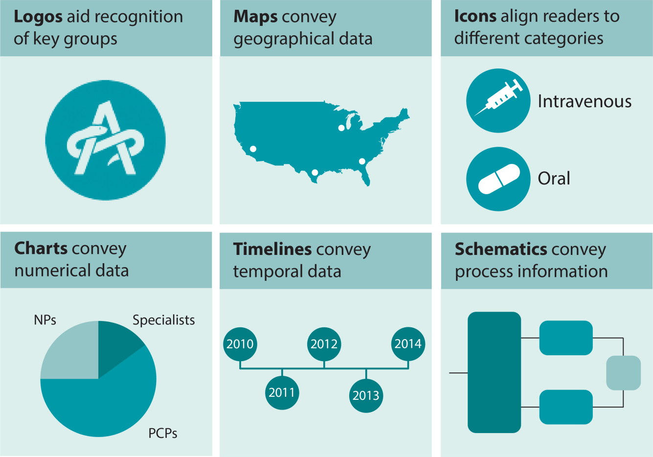 Multiple studies (Verdi et al ,1997; Patton, 1991) over many years have pointed to the effectiveness of the use of visuals in learning and retention. Of note, the use of illustrations or graphics presented together with short pieces of text are found to be most effective in learning. In the third step of our process, we consider which types of visuals are optimal in the delivery of our information. Visuals should aid, and not deter, from the information being presented. Specifically, if you were to remove any text accompanying the visual, the reader should still be able to get a sense of the information being conveyed.